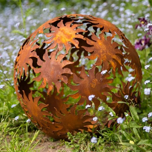 Ta wycinana laserowo metalowa rzeźba ogrodowa Dekoracyjna piłka jest atrakcyjną cechą ogrodu lub miejsca rozrywki na świeżym powietrzu. Oszałamiająca rzeźba ogrodowa na świeżym powietrzu wykonana z 3 mm zardzewiałych kawałków wycinanych laserowo ze stali miękkiej, wypaczonych w okrąg, który z czasem rdzewieje, aby rozwinąć własną unikalną patynę....